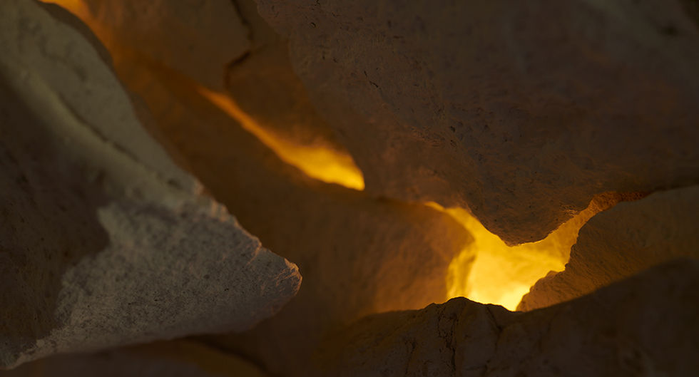 Während die Gips-Skulptur für Erdverbundenheit, materielle Präsenz und konservierte Erinnerung steht, eröffnet der „Cube“ einen flüchtigen, fluiden Erfahrungsraum. Das statische Material des Steins und das ephemere Lichtbild stehen in dialektischer Spannung zueinander – ein visuelles Sinnbild für den ewigen Wandel zwischen Vergangenheit, Gegenwart und Zukunft.