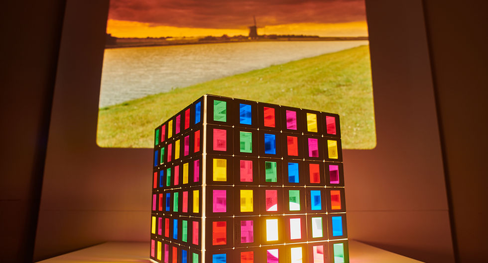 „Cube“, 2018, 30x30, Plexiglas mit Diahüllen, Farbfolie und Wechsellampe
